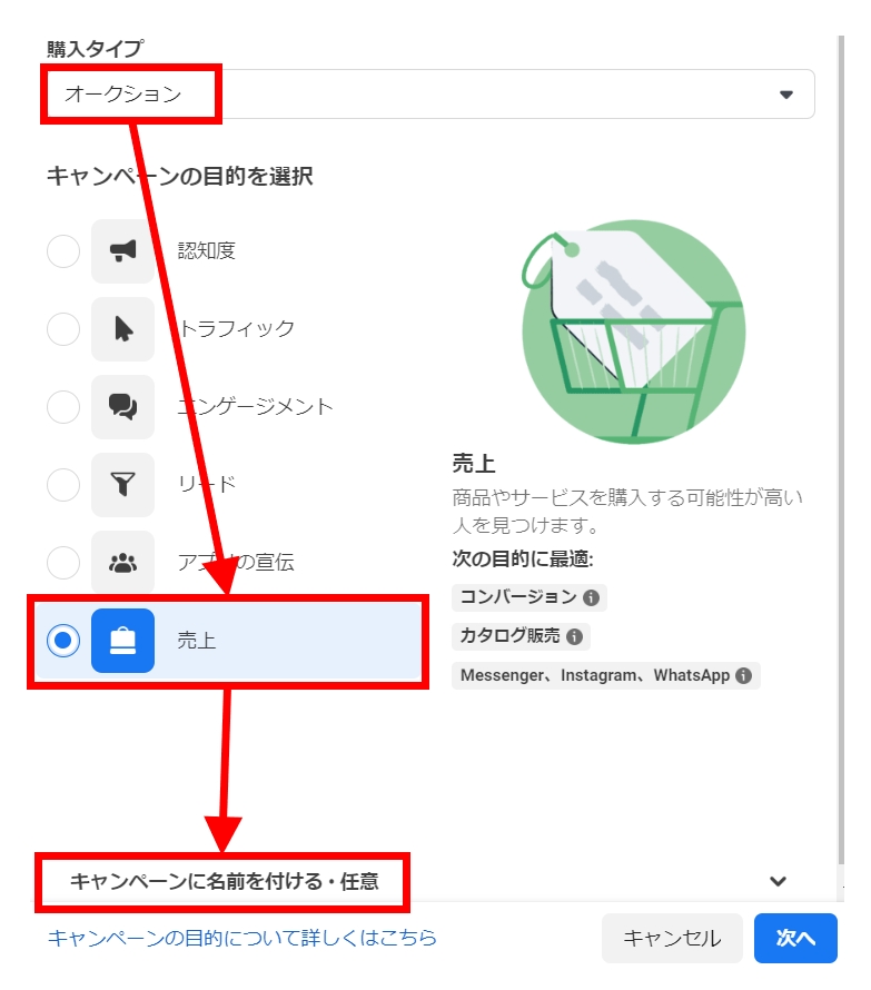 購入タイプは「オークション」、キャンペーンの目的は「売上」を選択し「キャンペーンに名前をつける・任意」をクリック