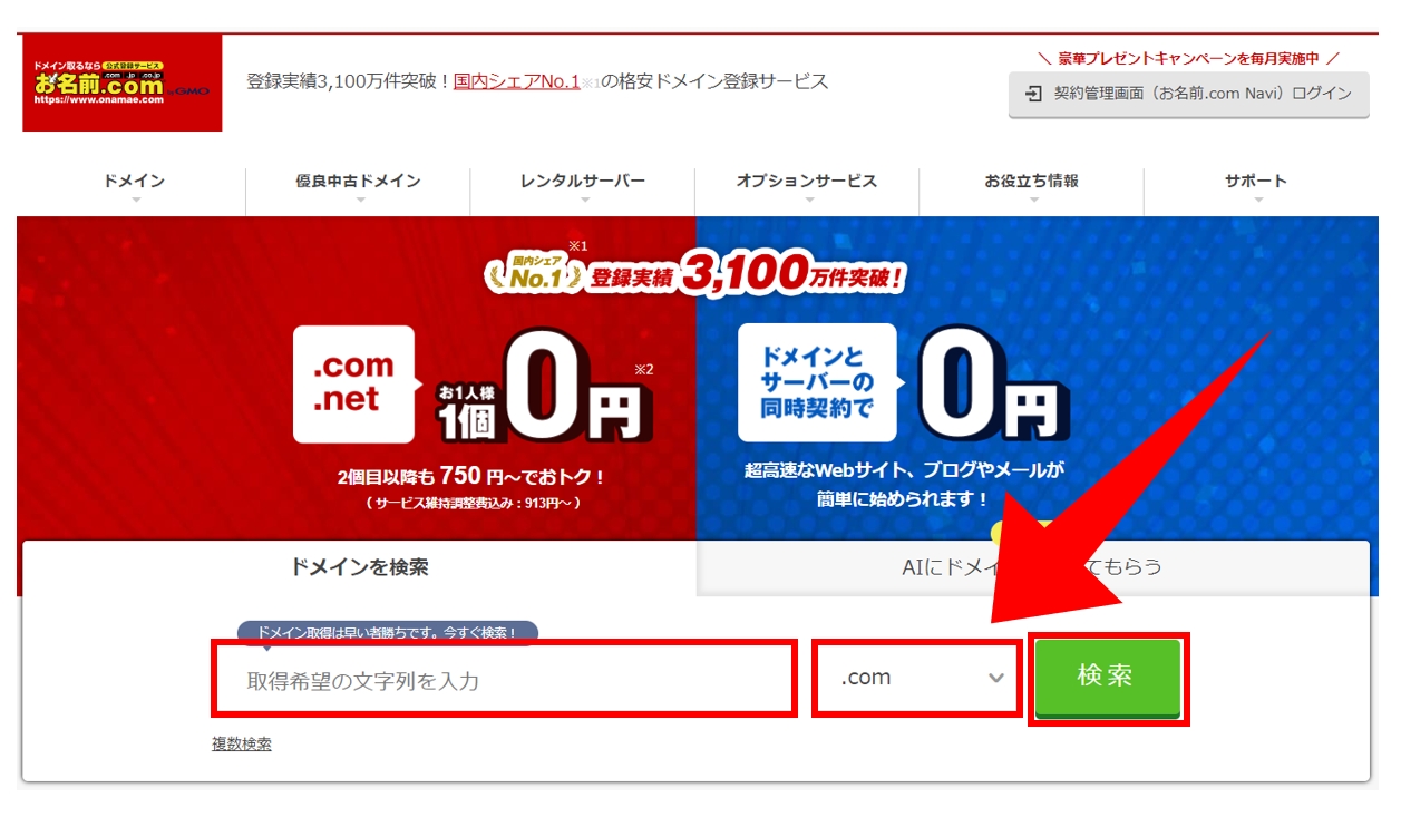「お名前.com」のサイトへ下記のリンクからアクセス