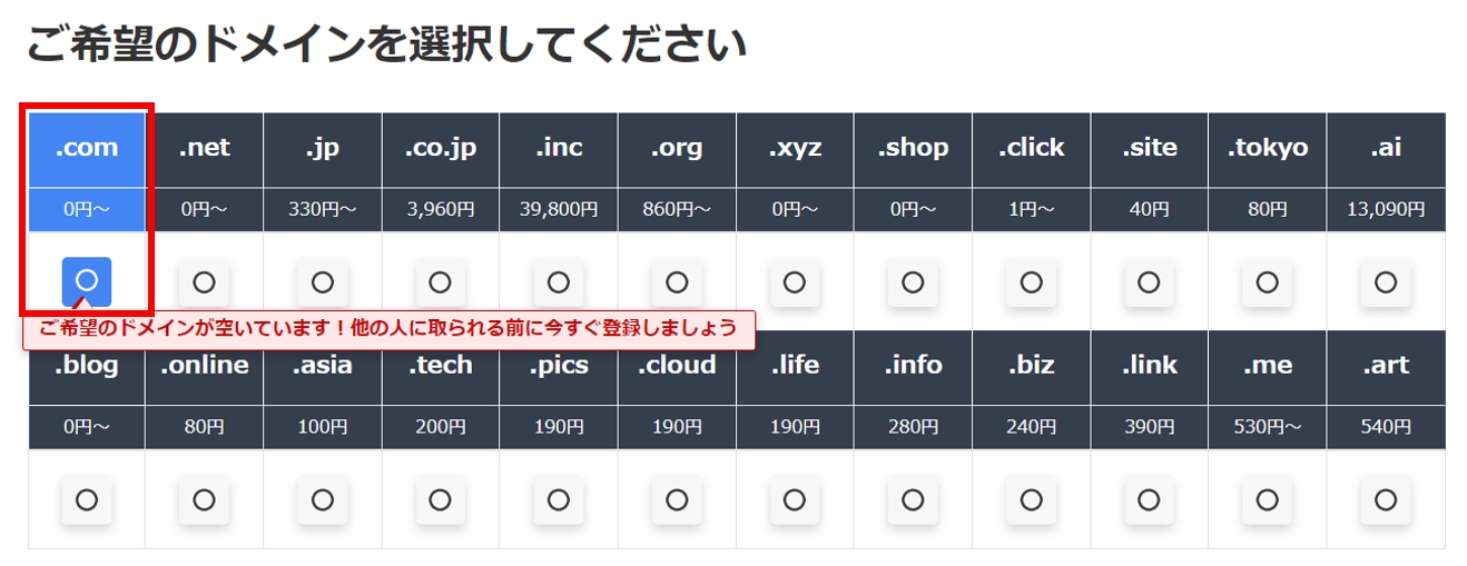 色々種類がありますが、迷ったら「.com」を選んでおけば間違いないでしょう。