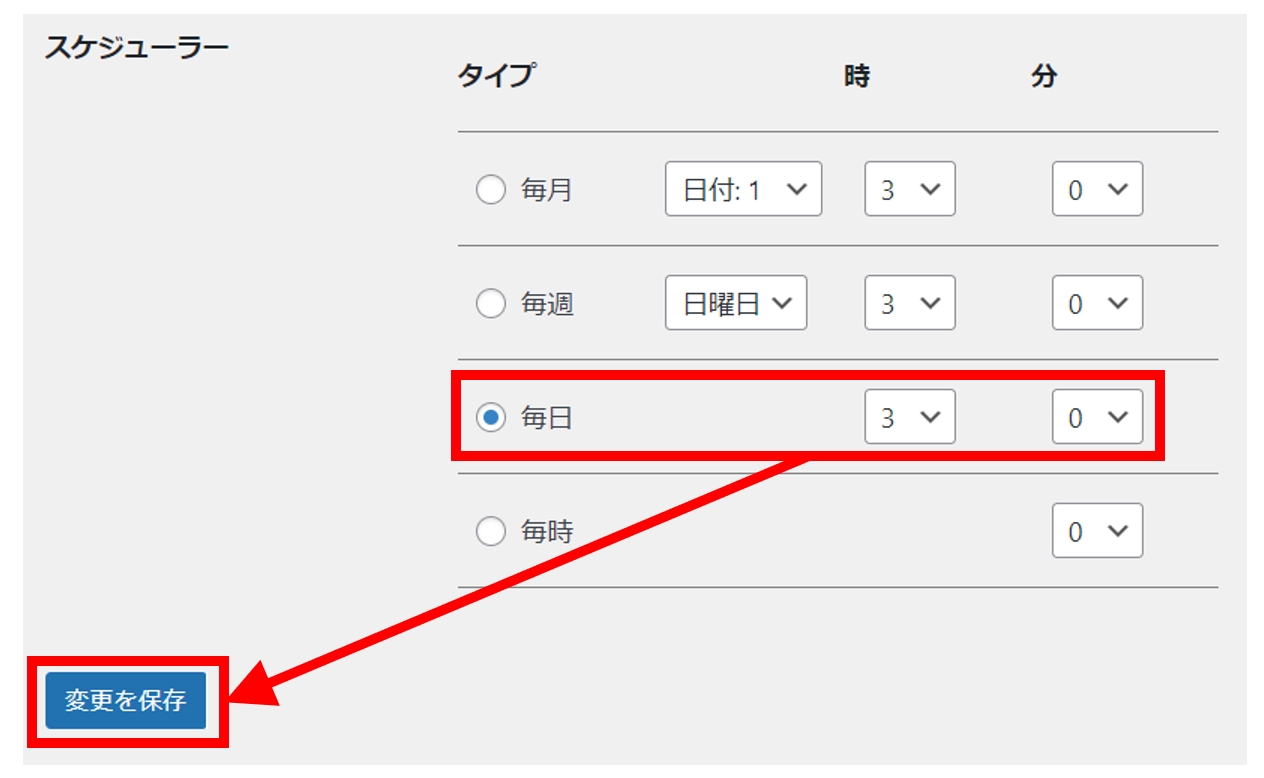 毎日」にチェックを入れ希望の時間を設定し「変更を保存
