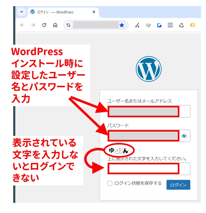 WordPress に設定した時のユーザー名とパスワードを入力